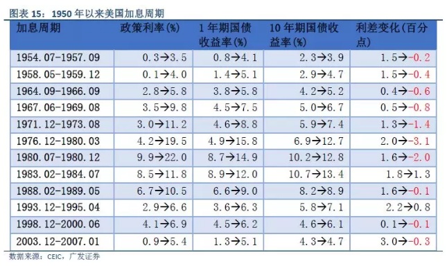 利率倒挂,都是由于短端利率上升快于长端利率引起的。理论上来说,利率倒挂可以是短端利率上升速度快于长端利率上升速度,或者短端利率下降速度小于长端利率下降速度。在现实生活中,后一种情形可以排除。图表7 显示,自1950 年以来,美国形成利率倒挂都是由于短端利率上升速度快于长端利率上升速度引起的。本轮利差收窄,也不例外。