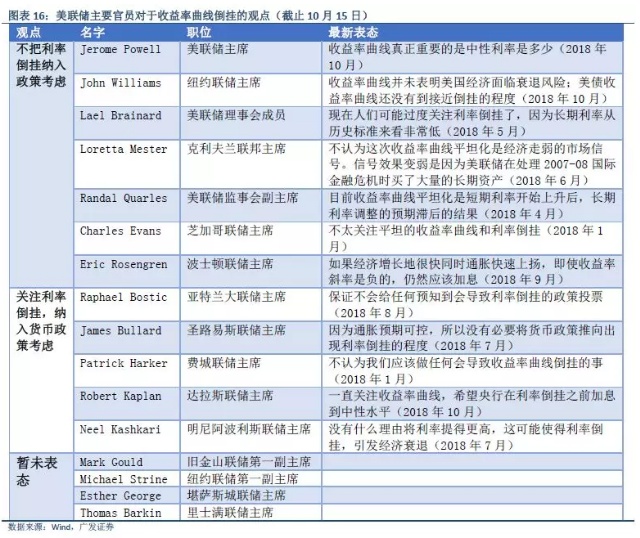 其实,目前不断缩小的长短端利差,已经引起了美联储官员对于期限利差倒挂的担忧。比如,Bullard就明确表示不能利率倒挂,而防止倒挂的办法就是停止加息。图表16总结了截止到目前美联储主要官员对于收益率曲线倒挂的观点。