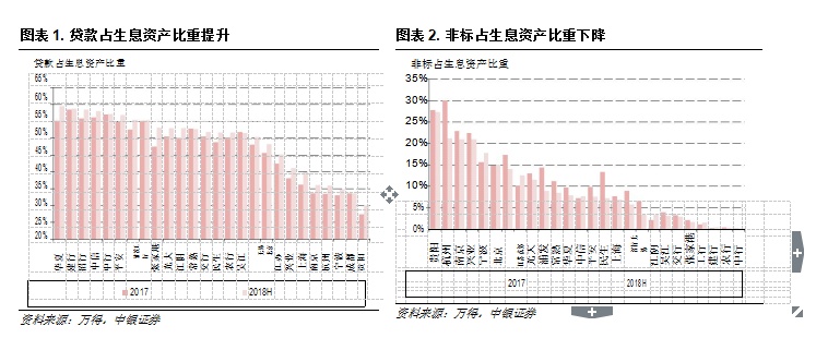 从 26 家上市银行的 2018 年半年末的资产结构来看,大部分银行的贷款占比较 2017 年提升,尤其是中小银行,贷款占比提升幅度高于大行,例如华夏银行、上海银行、兴业银行,2018 年半年末的贷款占生息资产比重较 2017 年分别提升4.4pct、3.7pct、2.9pct 至 55%、36%、38%。