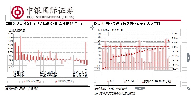 从上市银行的息差表现来看,随着下半年金融市场利率的下行,主动负债占比高的中小银行的息差改善幅度将高于大行。目前银行业基本面平稳,板块估值对应 18 年