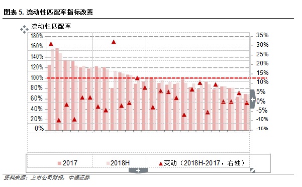 经过前期的结构调整,可以看到截至 2018 年半年末大部分银行的流动性匹配率指标较年初有不同程度的改善。从结构上来看,资负两端存贷业务占比更高的银行指标表现更好(例如大行、部分地方银行);从改善幅度来看,股份行较大行以及城商行明显。从下半年来看,我们认为随着结构调整的逐步到位以及资管新规执行细则对非标业务监管的“过渡性”放松,中小银行的业务调整压力缓解。
