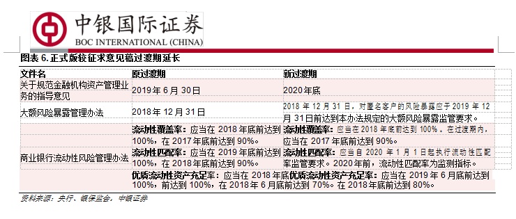 此外,我们发现今年落地的不少监管新规正式版虽然在监管要求上并未有明显放松,但是过渡期较征求意见稿有了一定的延长,政策可操作性增强。对银行而言,获得了更多适应监管新规的时间,整体压力有所减轻。