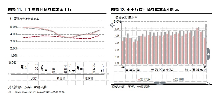 债券发行成本率也可以看到相同的趋势,大行、股份行、城商行上半年年化债券发行成本率较 2017年分别提升 11BP、25BP、19BP 至 1.9%、2.8%、2.7%。