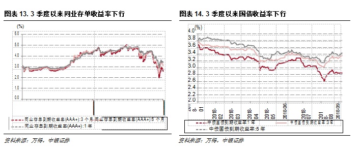(2)从 AAA+同业存单表现来看,7 月份以来 3 月期/6 月期/1 年期的平均到期收益率分别较上半年下行 1.58pct、1.15pct、0.93pct,由于银行同业存单以 3-6 月期为主,我们保守估计 3 季度同业存单收益率较上半年下行 100BP;