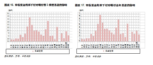 我们将其对银行前三季度以及全年息差的影响进行测算,从测算的结果来看,市场资金利率下行对中小银行的净息差改善幅度大于大行。从个股来看,改善幅度最大的兴业银行、上海银行、浦发银行,前三季度息差改善幅度分别为 4BP、4BP、3BP;全年息差改善幅度为 10BP、8BP、7BP。