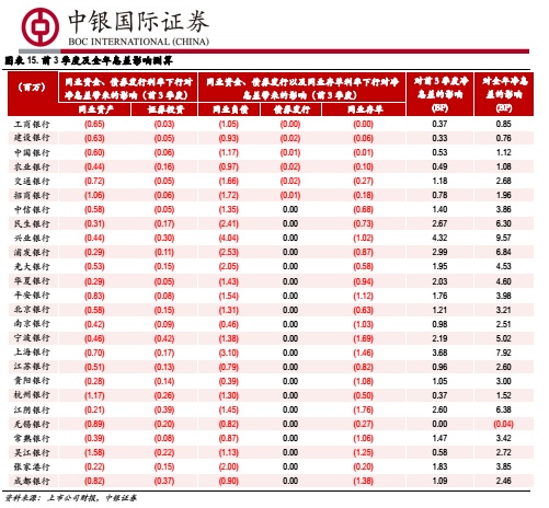 (3)从国债收益率来看,7 月份以来 10 年国债收益率中枢较上半年下行 16BP,因此我们假设 3 季度债券发行(扣除同业存单)成本率以及证券投资收益率均较上半年下行 15BP;