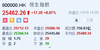 智通财经APP获悉,受市场忧虑加息困扰,美股隔晚(10月15日)全线下挫,但港股今早并未受到外围冲击。恒生指数开盘高开0.55%,报25586.16点。截至收盘,恒生指数涨17.2点或0.07%,报25462.26点,全日成交额达758.83亿。国企指数涨10198.33%,报53.99点,红筹指数涨0.93%,报4115.51点。