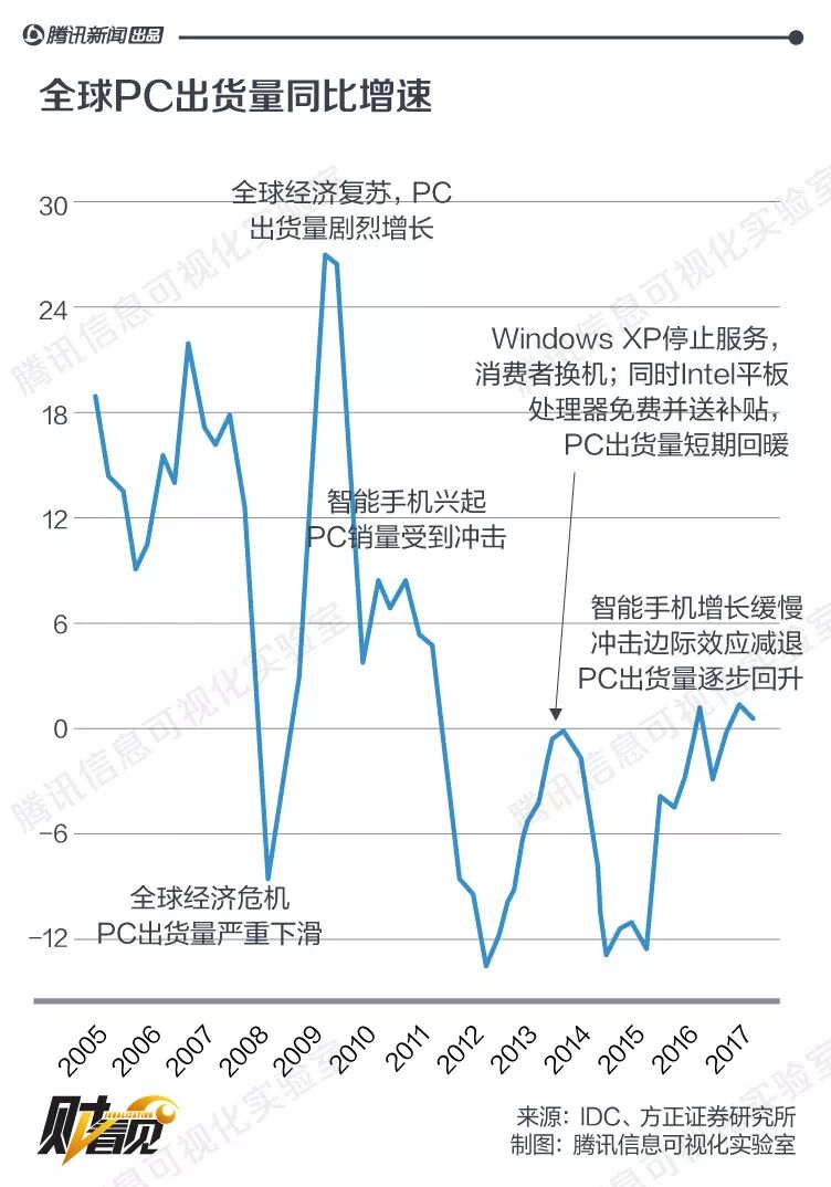 2012年以来,受全球经济增长缓慢影响,全球个人电脑业务的市场销量不断下滑,同时,智能手机销量的迅猛增长,降低了PC的整体换机率,也给PC业务带来巨大冲击。但受到全球手机增速放缓和商用市场新一轮需求增长的带动,全球个人电脑销量已经呈现逐渐稳定增长的趋势。从2015年第四季度开始,全球个人电脑业务的衰退幅度逐渐缩小,2018年同比转正,PC产业全面回暖。