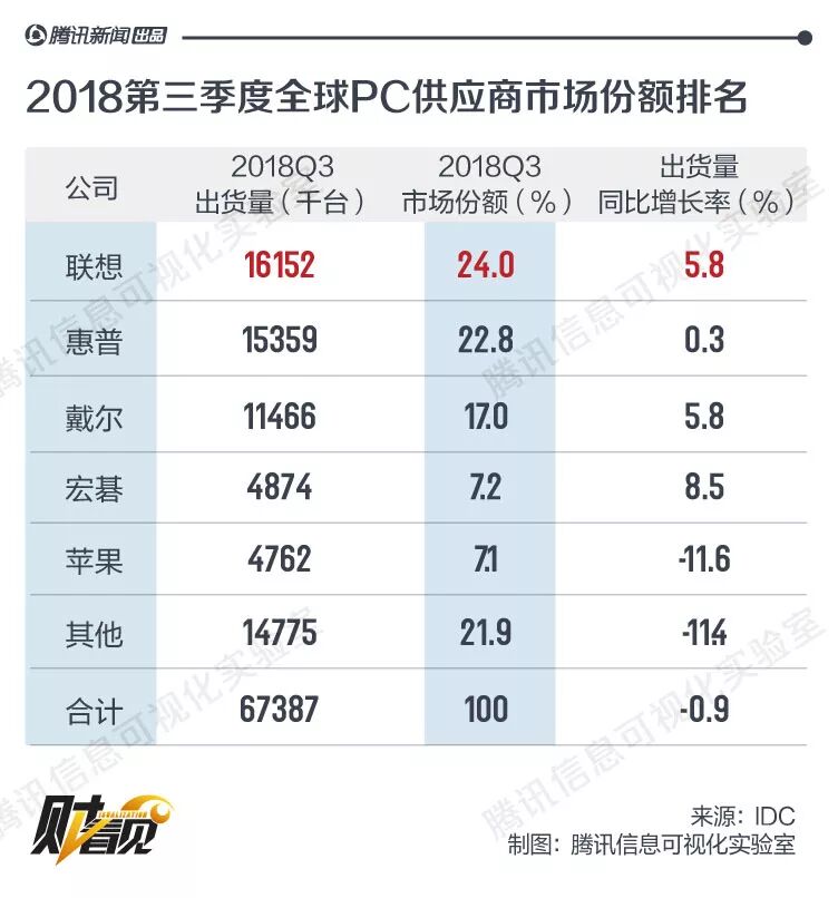 根据市场调研公司IDC和Gartner同时发布的2018年第三季度全球PC出货报告,按出货量和市场份额计算,联想均位列第一。IDC报告显示,全球PC供应商公司市场份额排名前五的分别为联想(24.0%),惠普(22.8%)、戴尔(17.0%)、宏碁(7.2%)和苹果(7.1%)。