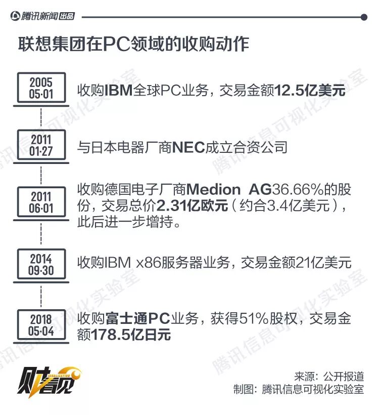 事实上,并购一直是联想扩大市场份额的重要手段之一。近几年,联想在PC业务领域的收购动作频频,其中包括IBM的全球PC业务、与日本电脑集团NEC成立合资公司,收购德国消费电子公司Medion等。