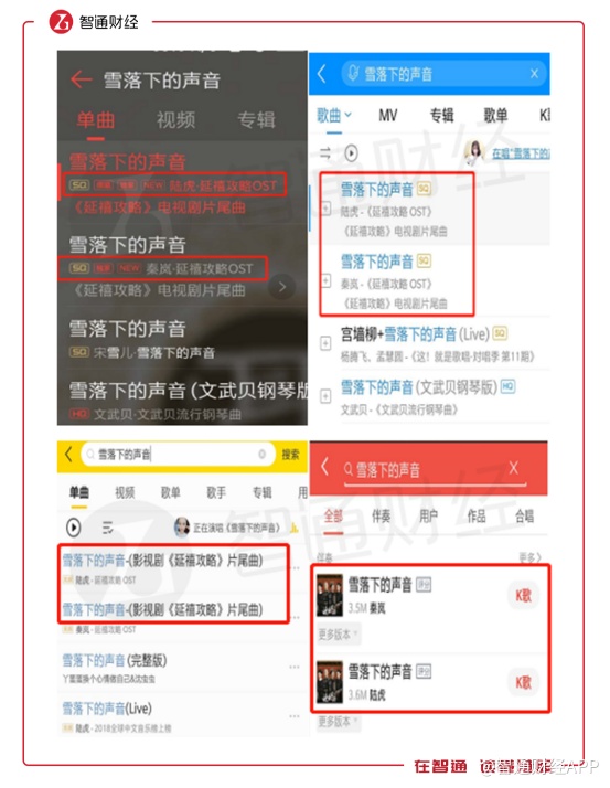 以此前热播剧《延禧攻略》的片尾曲《雪落下的声音》为例。这首歌的版权由QQ音乐独家拥有,并在APP中拥有“独家”的标识。但实际上,该歌曲在酷狗音乐、酷我音乐和全民K歌上同样可以播放,可以说腾讯音乐版权在公司旗下4个产品是通用的。