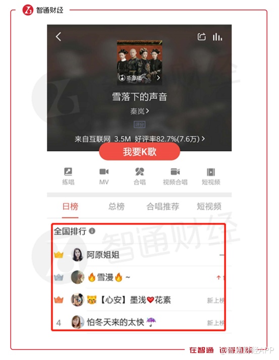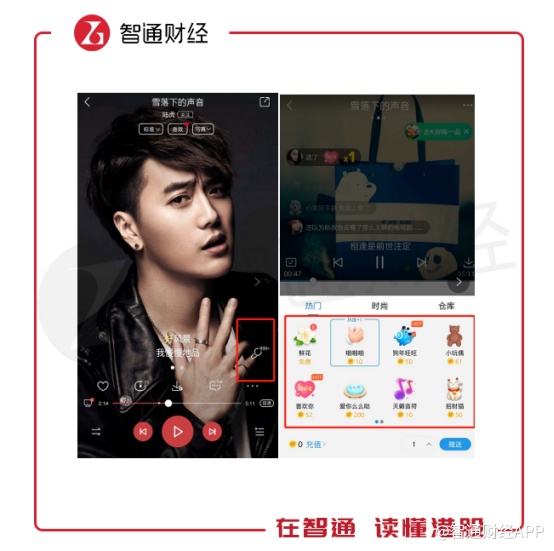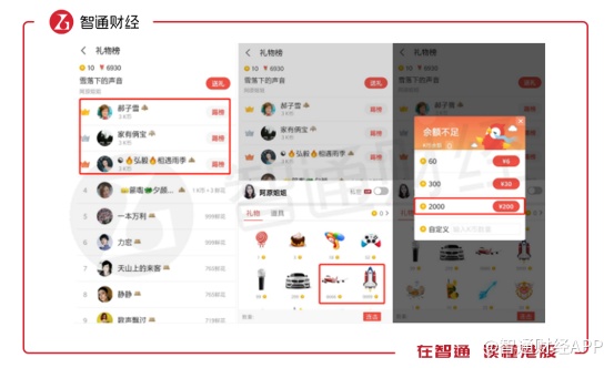 在用户进入K歌界面后,除了K歌按键还有就是歌曲榜单,这些榜单记录的是该歌曲翻唱获得礼物数的排行情况。翻唱歌手被打赏的礼物越多,榜单排名越高,礼物则是靠用户通过现金兑换而来。与直播打赏类似,全民K歌也是通过用户购买虚拟礼物进行变现。