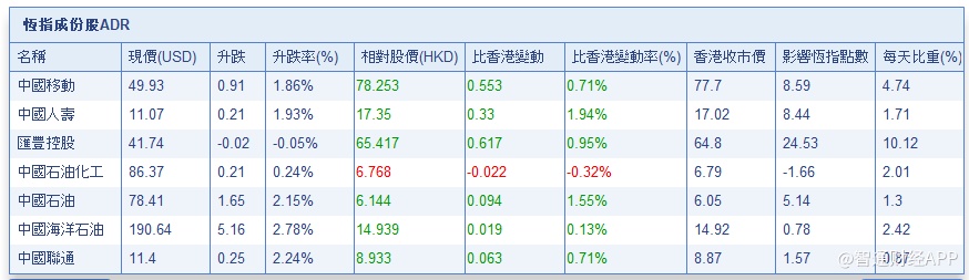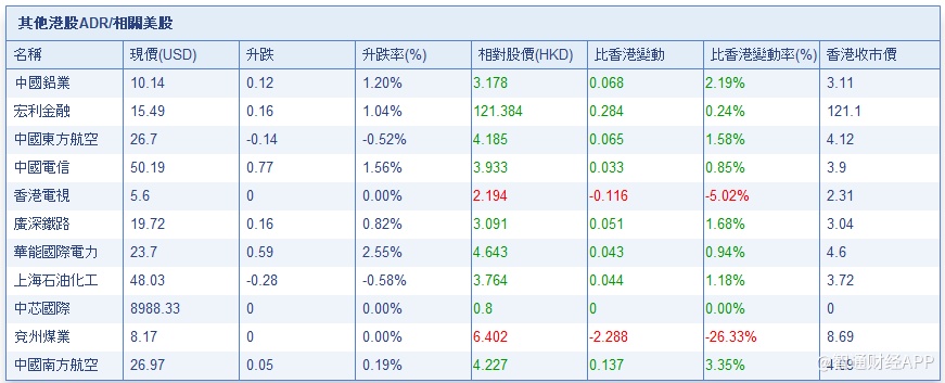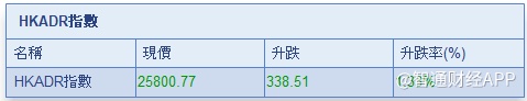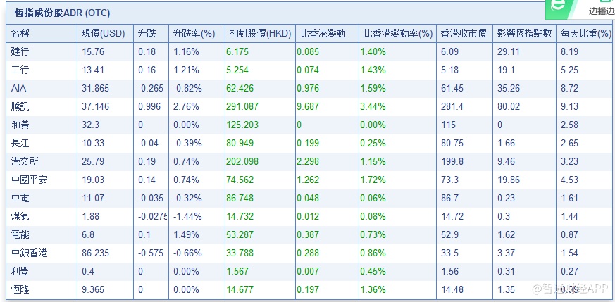 市场气氛转趋乐观,港股ADR指数亦全日上扬,按比例计算,收报25800.77点,升338.51点或1.33%。汇丰控股收报65.4元,较港收市升0.6元;腾讯控股收报291.08元,涨2.76%,较港收市升9.68元,升幅达到3.4%。