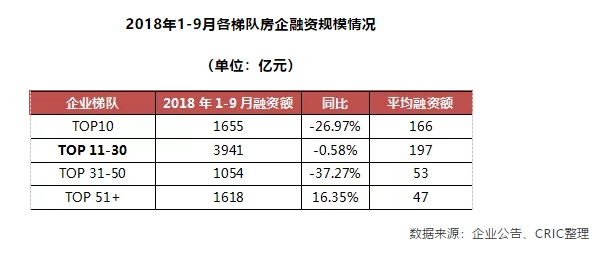 从各梯队来看, TOP10房企融资额为1655亿元,同比减少27%,若是剔除中国恒大的影响,其余TOP10房企的融资额同比增长14.4%,在融资收紧的情况还是有充足的融资实力。TOP11-30的房企整体融资额高达3941亿元,同比减少0.58%,平均融资额达197亿元,是融资最多的一个梯队,这些房企目前大多处于规模再增长的阶段,资金需求强烈,但在目前大环境收紧情况下,融资压力也有所增加。TOP50之后的企业平均融资规模47亿元,明显低于其他梯队企业,虽然同比增长率较高,但是增量有限,且增幅不断在收窄,该梯队企业上半年的融资额同比增加近23%,进入第三季度则同比基本持平,下半年以来TOP50之后有发债的企业只有5家,中小企业融资难问题更加显著。