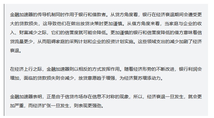用通俗的话来说明金融加速器,就是1.1*1.1=1.21,而0.9*0.9=0.81,两个大于1的数相乘会越来越大,两个小于1的数相乘会越来越小。