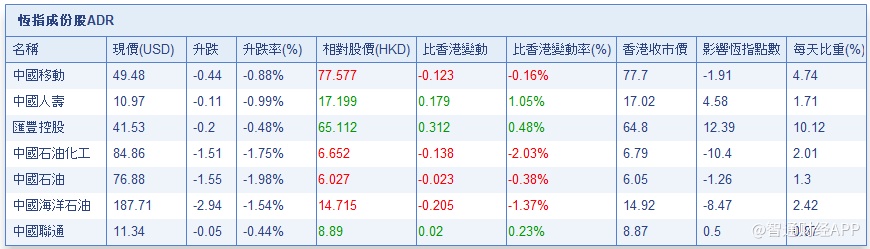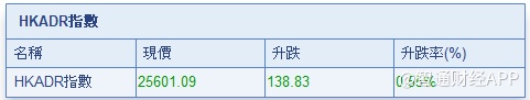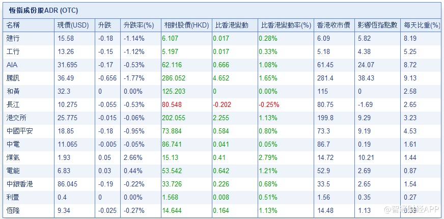 智通财经APP获悉,隔夜美股收市向下,但港股ADR指数全日向好,按比例计算,收报25601.09点,较港周二收市升138.83点。汇丰控股收报65.11元,较港收市升0.31元;腾讯控股收报285.81元,较港收市升4.41元。