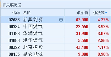 智通财经APP获悉,各地天然气调价,燃气股整体上涨,新奥能源(02688)领涨板块截至11时21分,新奥能源(02688)涨4.22%,报67.9港元,中国燃气(00384)涨3.92%,报22.55港元,华润燃气(01193)涨3.07%,报31.9港元。