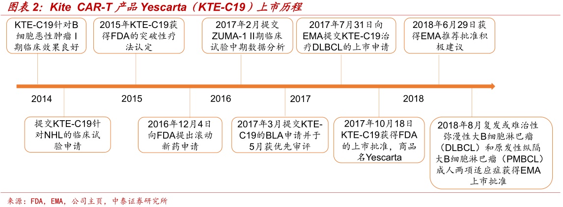 Kite产品Yescarta:2017年10月18日,FDA批准KitePharma的CAR-T细胞产品Yescarta(axicabtageneciloleucel,KTE-C19)上市,用于治疗复发/难治性大B细胞淋巴瘤的成人患者(DLBCL)。2018年8月,Yescarta用于治疗复发或难治性弥漫性大B细胞淋巴瘤(DLBCL)和原发性纵隔大B细胞淋巴瘤(PMBCL)两个适应症同时在欧洲获批上市。