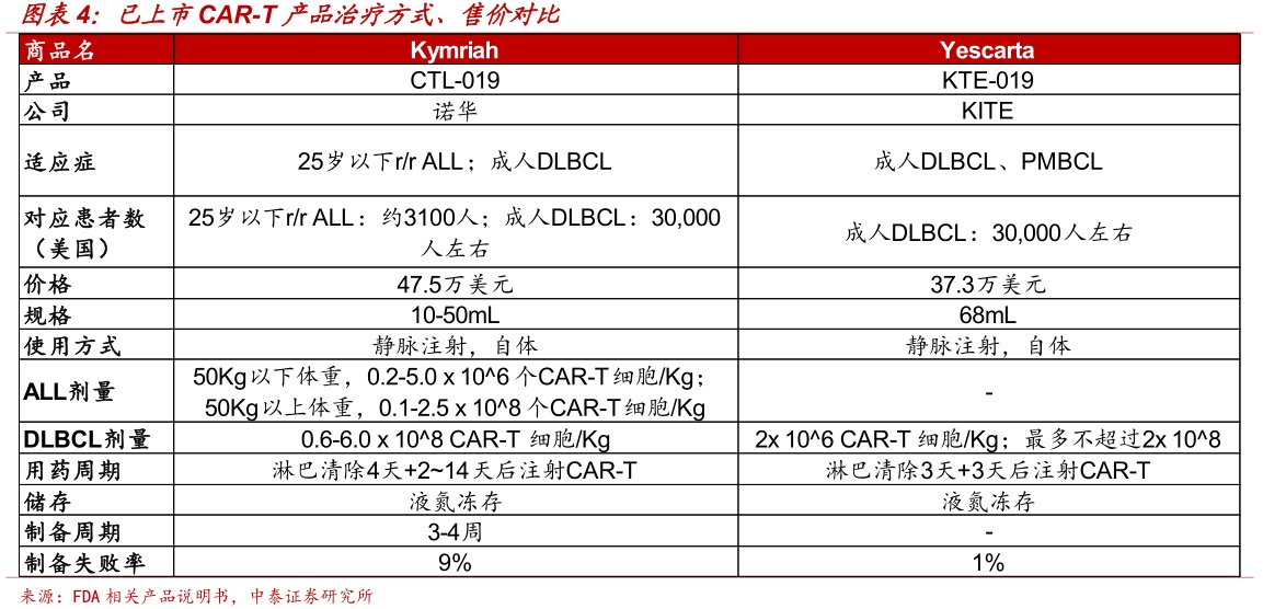 CAR-T产品定价相对较高,研发和生产是主要壁垒。目前已上市的两个CAR-T产品受制于研发和生产难度(自体使用,制备失败率)定价较高,Kymriah和Yescarta定价分别为47.5万美元和37.3万美元。两者在不同适应症上使用剂量上略有差异。