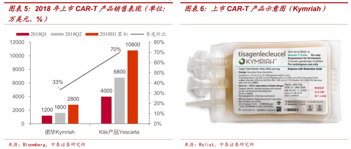 CAR-T产品从申报上市到获批历时仅6个月左右、速度超乎想象,我们认为疗效价值获得认可。虽然受制于研发和生产难度(自体使用,制备失败率)定价较高,Kymriah和Yescarta定价分别为47.5万美元和37.3万美元。但医保仍然较为认可。美国医疗保险与医疗服务中心CMS将CAR-T纳入报销体系,包括基本支付3.6万美元和最大NTAP(新技术附加付款)18.65万美元。Kymriah2018Q1和2018Q2销售额分别为1200万美元和1600万美元,季度环比增长约33%。Yescarta在2018Q1和2018Q2分别实现销售额4000万美元和6800万美元,季度环比增长70%。2018年上半年两个产品累积销售过亿美元,我们预计渗透率已达约3%-6%。