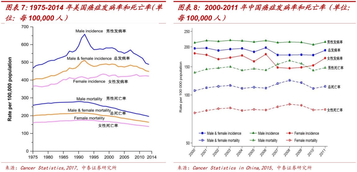 中国肿瘤发病率和死亡率不断上升,肿瘤后期用药市场刚需大。美国每十万人中肿瘤新发病率呈现上升趋势,从1973年的300/10万人上升到2014年的450/10万人左右,平均222人中就有一人新患癌症。近10年随着控制吸烟、推广癌症筛查和应用新型疗法癌症发病率和死亡率逐年下降。2014年癌症总发病人数168.88万人,死亡人数60.09万人。中国的情况则不同,2011年我国新增癌症病例约337万例,比2010年增加28万例;死亡人数约211万。2011年癌症总体发病率约200/10万人左右。预计2015年中国癌症发病人数达到429.2万人、死亡人数281.4万人。由于环境变差、人口老龄化加剧等原因,中国癌症发病率和死亡率在近年来逐步攀升,肿瘤用药特别是中后期用药市场大。