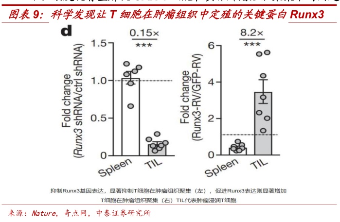 Ø美国加利福利亚大学圣地亚哥分校的Goldrath教授与来自斯克里普斯的Pipkin教授合作发现驱动T细胞离开淋巴组织聚集在外周以及肿瘤组织中的关键—Runx3蛋白。在小鼠体内证明,增加这一基因的表达可以显著增强过继性T细胞在实体瘤中的聚集增强治疗效果。该发现有望解决CAR-T细胞在实体肿瘤组织聚集难的问题。