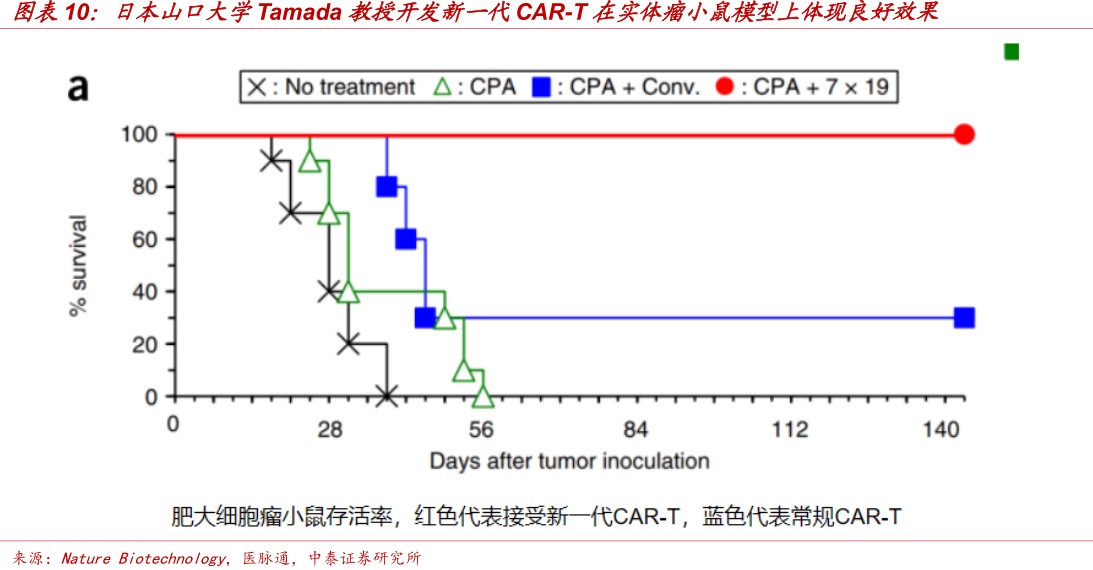 Ø日本山口大学Tamada教授开发新一代CAR-T,在常规CAR-T基础上进行改造使其表达IL7和CCL19两种趋化因子。在多种实体瘤小鼠模型中,全新CAR-T治疗实体瘤的效果是目前常规CAR-T的至少4倍,对于常规CAR-T几乎无效的实体瘤新一代CAR-T也能实现肿瘤的完全消除。全新一代CAR-T还解决了常规CAR-T治疗后易复发的难题。