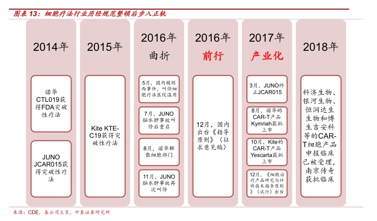 《细胞治疗产品研究与评价技术指导原则》正式落地,国内细胞治疗行业经历整顿和规范2017年重入正轨。2017年12月22日,CFDA出台《细胞治疗产品研究与评价技术指导原则》(试行)。《原则》第一次在国内权威定义按照药品管理规范研发的细胞治疗产品,对细胞产品的制备工艺提出高要求,对行业整体态度积极、推进CAR-T产品作为临床急需新药在我国尽早上市,包括“可接受非注册试验数据”、“临床试验分为早期临床试验和确证