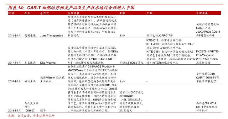 海外成熟产品技术引入国内,力助力CAR-T细胞国产化。2016年起国内医药巨头陆续通过和海外成熟CAR-T产品公司合作,将CAR-T产品引入国内。2016年4月,药明康德宣布和JunoTherapeutics在上海成立合资公司药明巨诺,共同开展CAR-T和TCR疗法的研发和生产;2018年6月,上海药明巨诺及其关联公司上海明聚生物的CAR-T产品JWCAR029的IND申请获得CFDA批准。2017年1月,复星医药宣布通过旗下全资子公司成立中外合营企业,在中国引进KitePharma的CAR-T治疗产品KTE-C19等;2018年5月该产品已申报临床。2018年9月,诺华与西比曼生物科技集团(CBMG)宣布达成战略许可和合作协议,为中国患者生产制造CAR-T细胞治疗药物。至此,海外CAR-T细胞疗法最成熟、进度最快的三家企业产品即将全部进入中国。此外,安科生物和德国Miltenyi默天旎生物技术合作引入全自动化CAR-T细胞制备工厂。