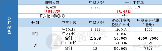 其中,公开配售申购人数6428,一手中签率30%,认购倍数18.43倍。