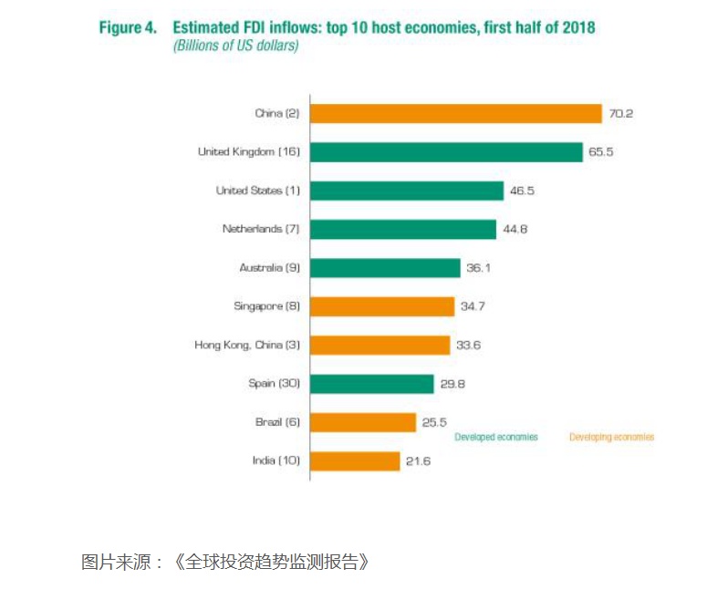 智通财经了解到,早前联合国贸易和发展会议(UNCTAD)发布的《全球投资趋势监测报告》显示,2018年上半年,全球海外直接投资同比大幅下降41%,降至4700亿美元,随着美企撤资,欧洲整体资金减少93%,而有700多亿美元流入中国,远超过英国660亿美元FDI和美国465亿美元FDI,一跃成为全球外国直接投资流入最高的国家。