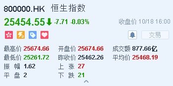 智通财经APP获悉,昨天因为重阳节港股休市。恒生指数开盘涨0.83%,报25674.66点。但受A股拖累再度大挫,恒指反覆向下,尾盘跌幅收窄。截至收盘,恒生指数跌7.71点或0.03%,报25454.55点,全日成交额达877.66亿。国企指数跌0.6%,报10136.76点,红筹指数涨0.17点,报4115.68点。