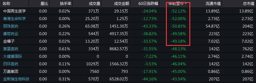 大市不景气,落到细分板块更是“唇亡齿寒”。以医药板块为例,智通财经APP发现,A股整体已跌掉了25个点;港股半斤对八两,超过22个点,丽珠医药(01513)、康哲医药(00867)等市值股票百亿的票跌幅高达49%,简直是要把去年随大势积攒的点“压箱底”败光的节奏。