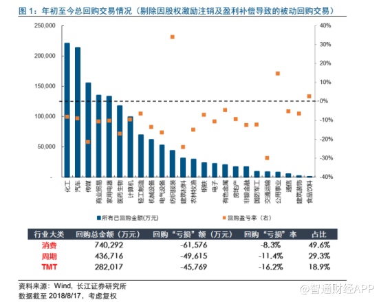 据长江证券统计,截至8月中,共有218家A股上市公司实施或拟实施350次回购交易,回购金额约为146亿元,但该笔回购资金已亏损了约16亿。