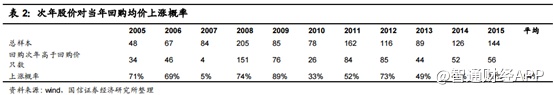 上图为当年平均回购价持有至次年年底的上涨概率,统计下来,这种上涨概率均值仅为 54%,并无明显的赚钱效应,反倒是在市场向好的年份上涨概率更高。这意味着回购能否达到传递信心的效果,取决于大盘的走势。