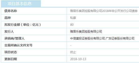 10月13日据上交所披露信息,雅居乐一笔拟非公开发行的2018年公司债被终止发行,债券规模为80亿元。