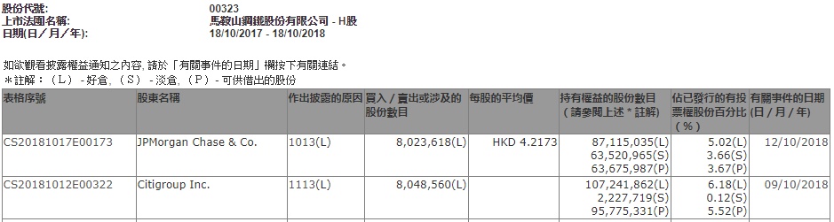 智通财经APP获悉,根据香港联交所资料显示,摩根大通于10月12日增持马鞍山钢铁(00323)802万股,每股作价4.21港元,总值约3376万港元,最新持股量增至5.02%。