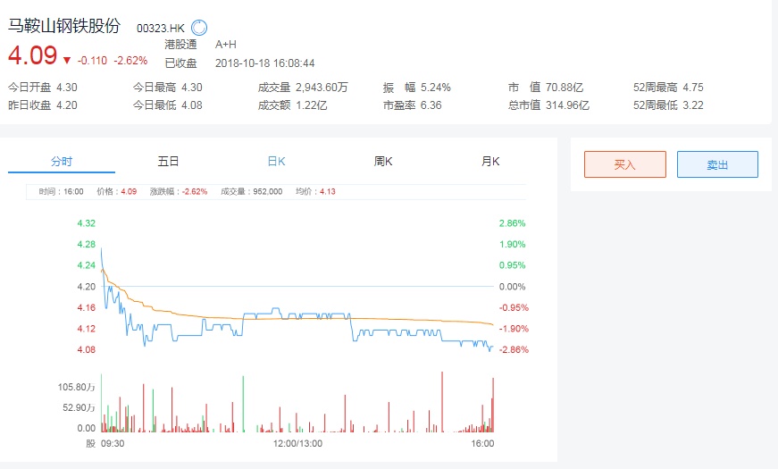 截至今日收盘,马鞍山钢铁(00323)报4.09港元,跌0.11或2.62%。