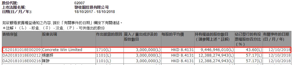 智通财经APP获悉,根据香港联交所资料显示,Concrete Win Ltd于10月12日增持碧桂园(02007)300万股,每股作价8.4港元,总值约2520万港元,最新持股量增至43.6%。