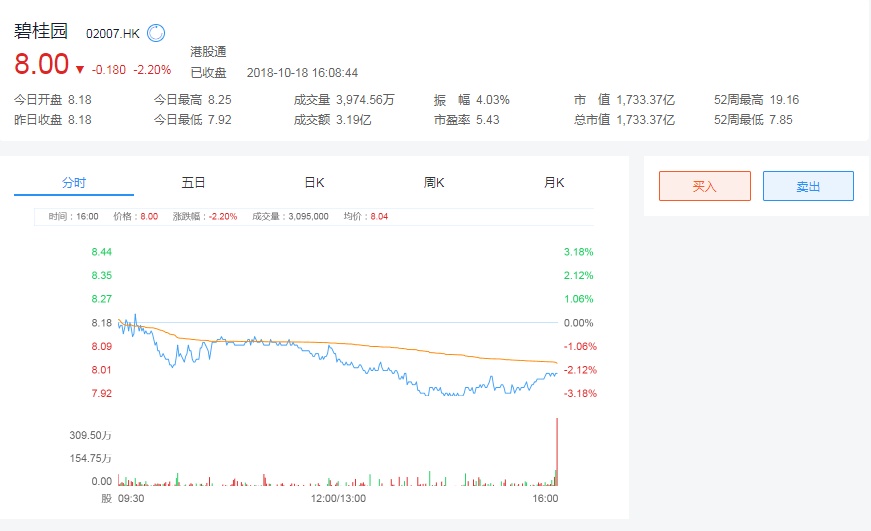 截至今日收盘,碧桂园(02007)报8港元,跌0.18或2.2%。