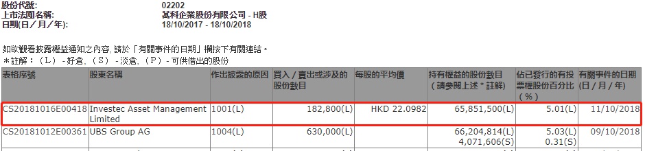智通财经APP获悉,根据香港联交所资料显示,Investec Asset Management Ltd于10月11日增持万科企业(02202)18万股,每股作价22港元,总值约396万港元,最新持股量增至5.01%。