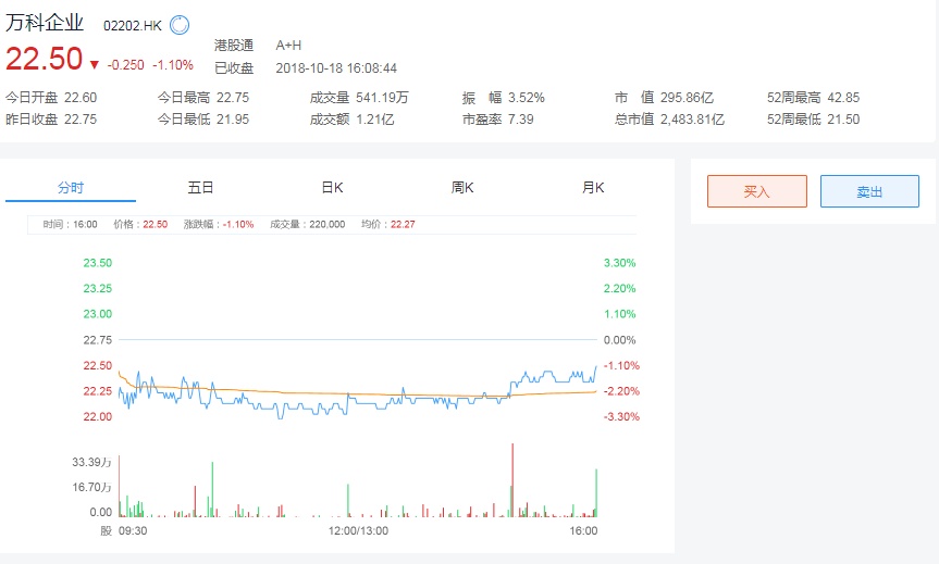 截至今日收盘,万科企业(02202)报22.5港元,跌0.25或1.1%。