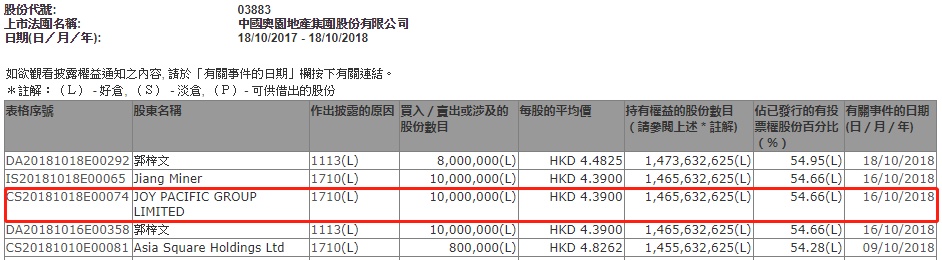智通财经APP获悉,根据香港联交所资料显示,JOY PACIFIC GROUP LTD于10月16日增持中国奥园(03883)1000万股,每股作价4.39港元,总值约4390万港元,最新持股量增至54.66%。