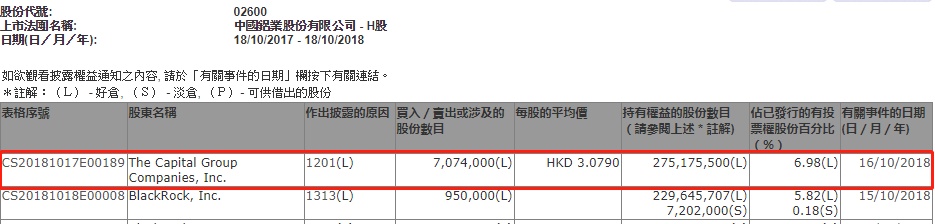 智通财经APP获悉,根据香港联交所资料显示,The Capital Group于10月16日减持中国铝业(02600)707万股,每股作价3.07港元,总值约2170万港元,最新持股量降至6.98%。