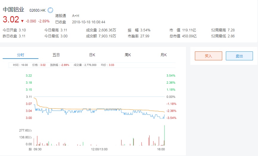 截至今日收盘,中国铝业(02600)报3.02港元,跌0.09或2.98%。
