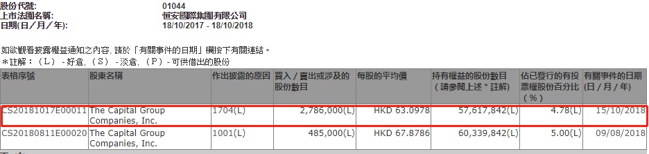 智通财经APP获悉,根据香港联交所资料显示,The Capital Group于10月15日减持恒安国际(01044)278万股,每股作价63港元,总值约1.75亿港元,最新持股量降至4.78%。