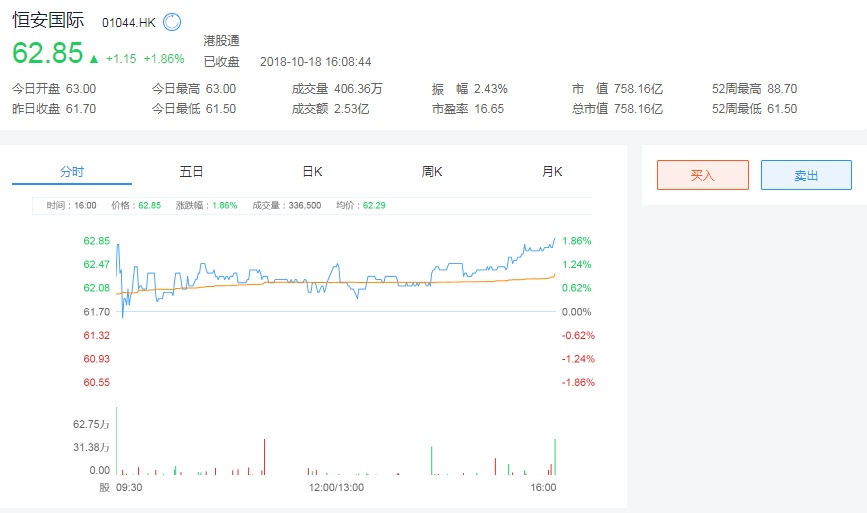截至今日收盘,恒安国际(01044)报62.85港元,跌1.15或1.86%。