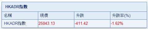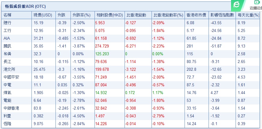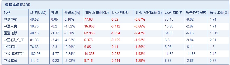 隔夜美股暴跌,港股ADR指数走势疲弱,按比例计算,收报25043.13点,跌411.42点或1.62%。大型蓝筹全线受压,汇丰控股收报62.94元,较港收市跌1.61元;腾讯控股收报274.42元,较港收市跌6.58元。