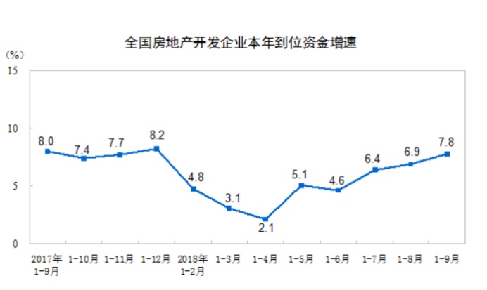 1-9月份,房地产开发企业到位资金121882亿元,同比增长7.8%,增速比1-8月份提高0.9个百分点。其中,国内贷款18041亿元,下降5.1%;利用外资43亿元,下降61.7%;自筹资金40596亿元,增长11.4%;定金及预收款40259亿元,增长16.3%;个人按揭贷款17522亿元,下降1.2%。
