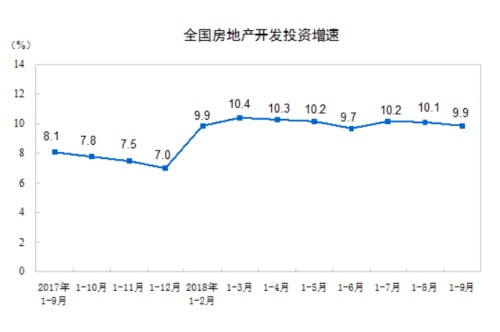 智通财经APP获悉,在10月19日(周五)上午,国家统计局发布了本年度前三季全国房地产投资开发和销售情况。据数据显示,中国1至9月全国房地产开发投资同比增长9.9%,较1至8月小幅回落0.1%。